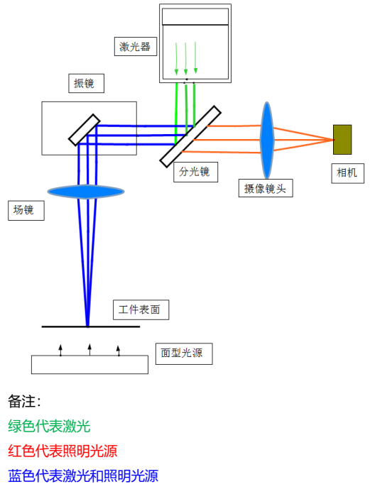 ①、工件表面上的特征信息依次經(jīng)過(guò)場(chǎng)鏡、振鏡,并透過(guò)分光鏡,經(jīng)過(guò)攝像鏡頭成實(shí)像至相機(jī)上;