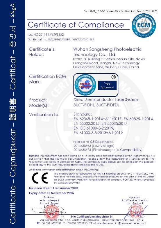 松盛光電榮獲直接半導體激光器系統(tǒng)(Direct Semiconductor Laser System)歐盟認證合格證書